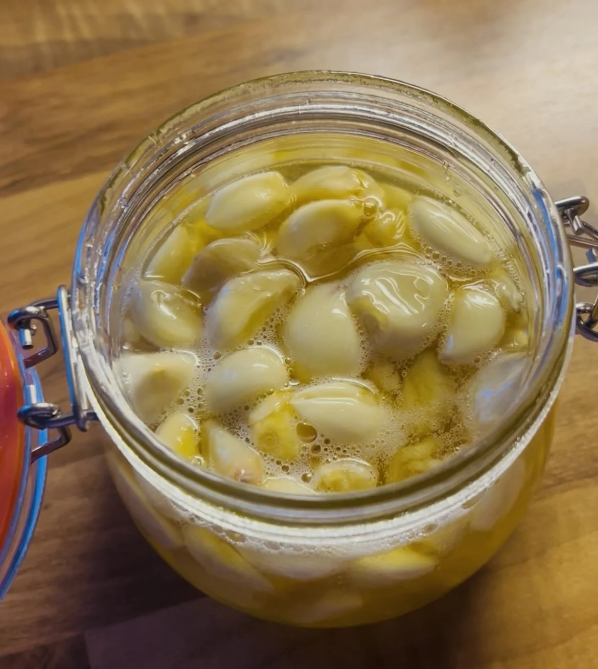 Valkosipulinkynsien tulisi olla kauttaaltaan hunajan peitossa. Jätä purkin yläosasta noin neljäsosa tyhjäksi, jotta fermentoinnin aikana syntyvä kaasu ei työnnä hunajaa yli reunan ja seosta pystyy ravistelemaan.