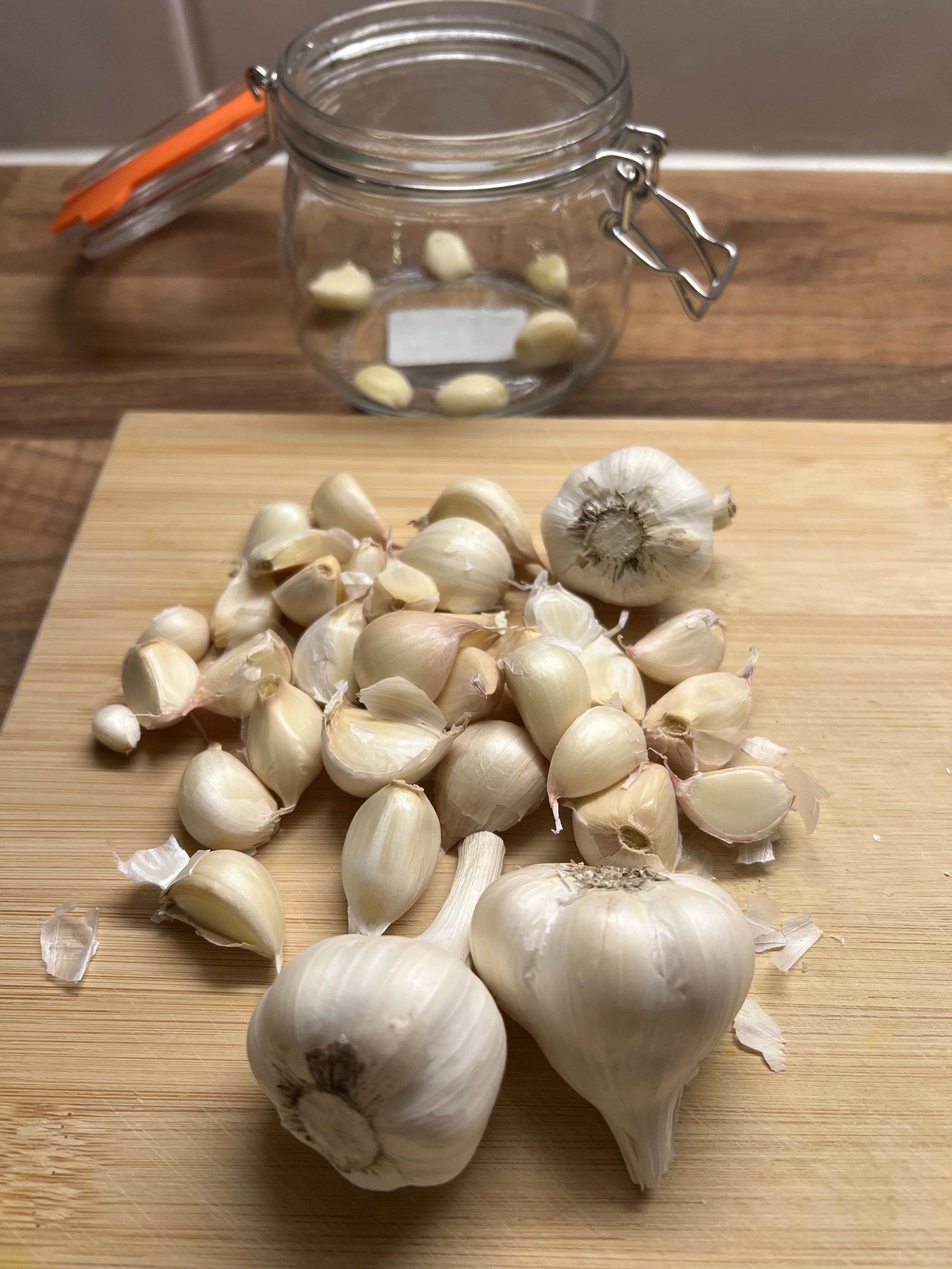 Kuori valkosipulinkynnet ja laita ne puhtaaseen lasipurkkiin. Halutessa kynnet voi murskata kevyesti niin, että ne säilyvät kuitenkin kokonaisina.