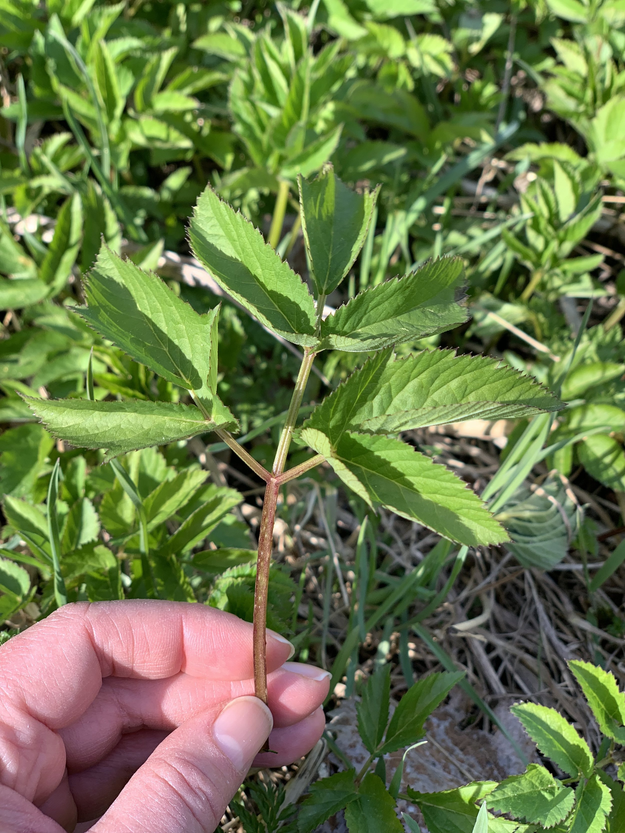 Tässä kuvassa tummalehtinen karhunputki kasvaa vaalealehtisen vuohenputkikasvuston keskellä.